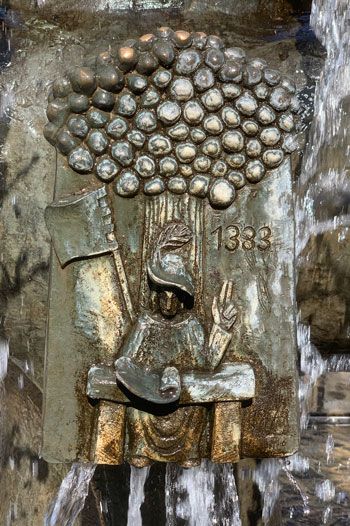 Der Text auf der Reliefplatte ist deutlich zu lesen: Kirchenmauer, dir klage ich: „Ich heiße Maria Anna Wieferich. Ich nehme Erbsen in die Hand und streu sie übers Land und Sand. Ein ganzes Häufchen soll euch künden, allwo ich arme Maid zu finden.“
