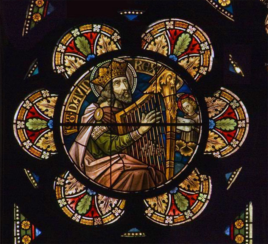 Links spielt David die Harfe, ebenfalls ein sehr verbreitetes Motiv der abendländischen Kunst. Der Harfe selbst ist hier ein Gesicht verliehen und sie scheint zu singen. Sie spielt eine wichtige Rolle im Verhältnis zwischen König Saul und seinem späteren Nachfolger David, der hier als DAVID REX (König David) bezeichnet wird. Bei Samuel 16, 23 heißt es: „Sooft nun der böse Geist von Gott über Saul kam, nahm David die Harfe und spielte darauf mit seiner Hand. So wurde es Saul leichter, und es ward besser mit ihm, und der böse Geist wich von ihm." Auch werden im Buch der Psalmen viele Lieder David zugeschrieben.